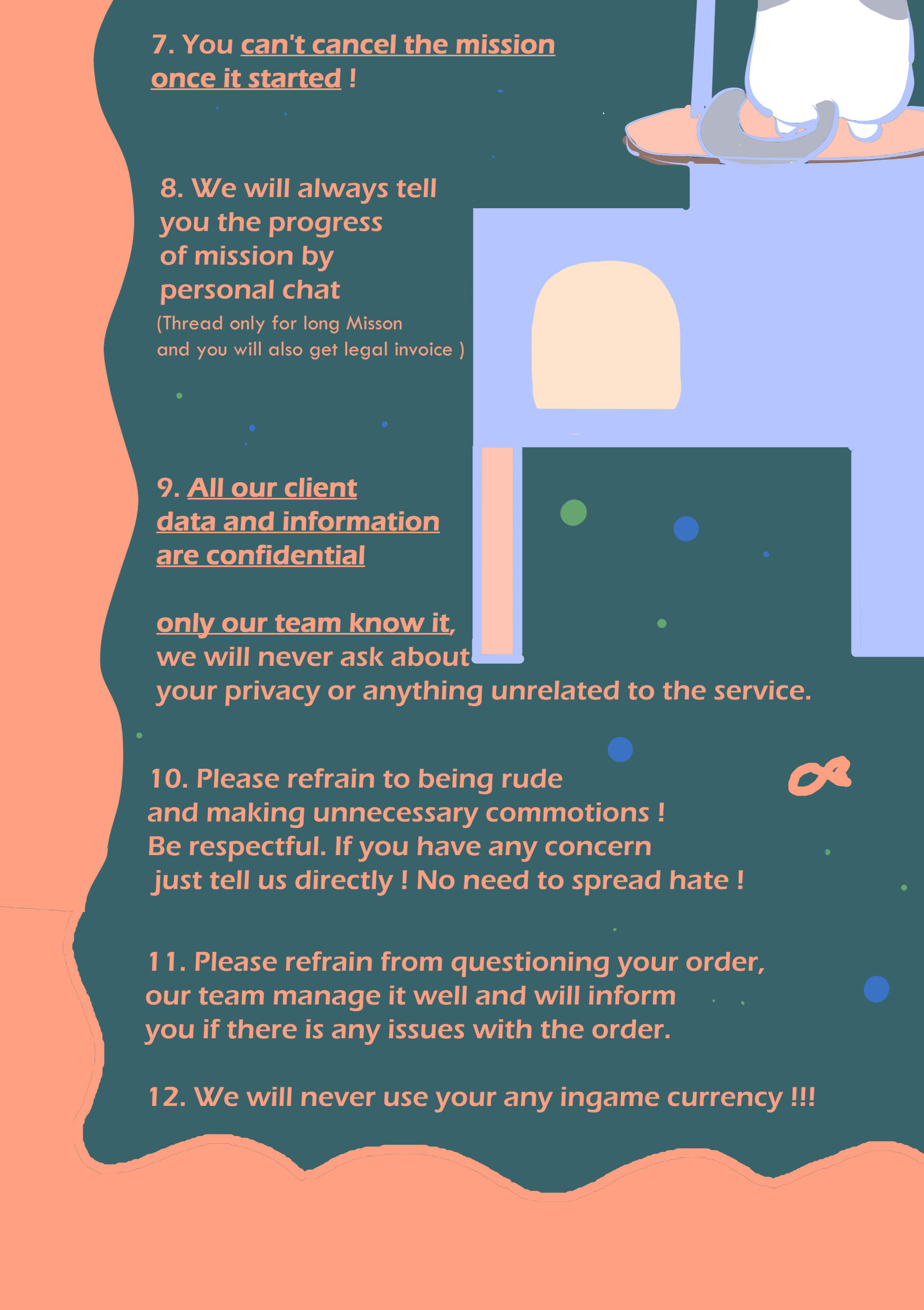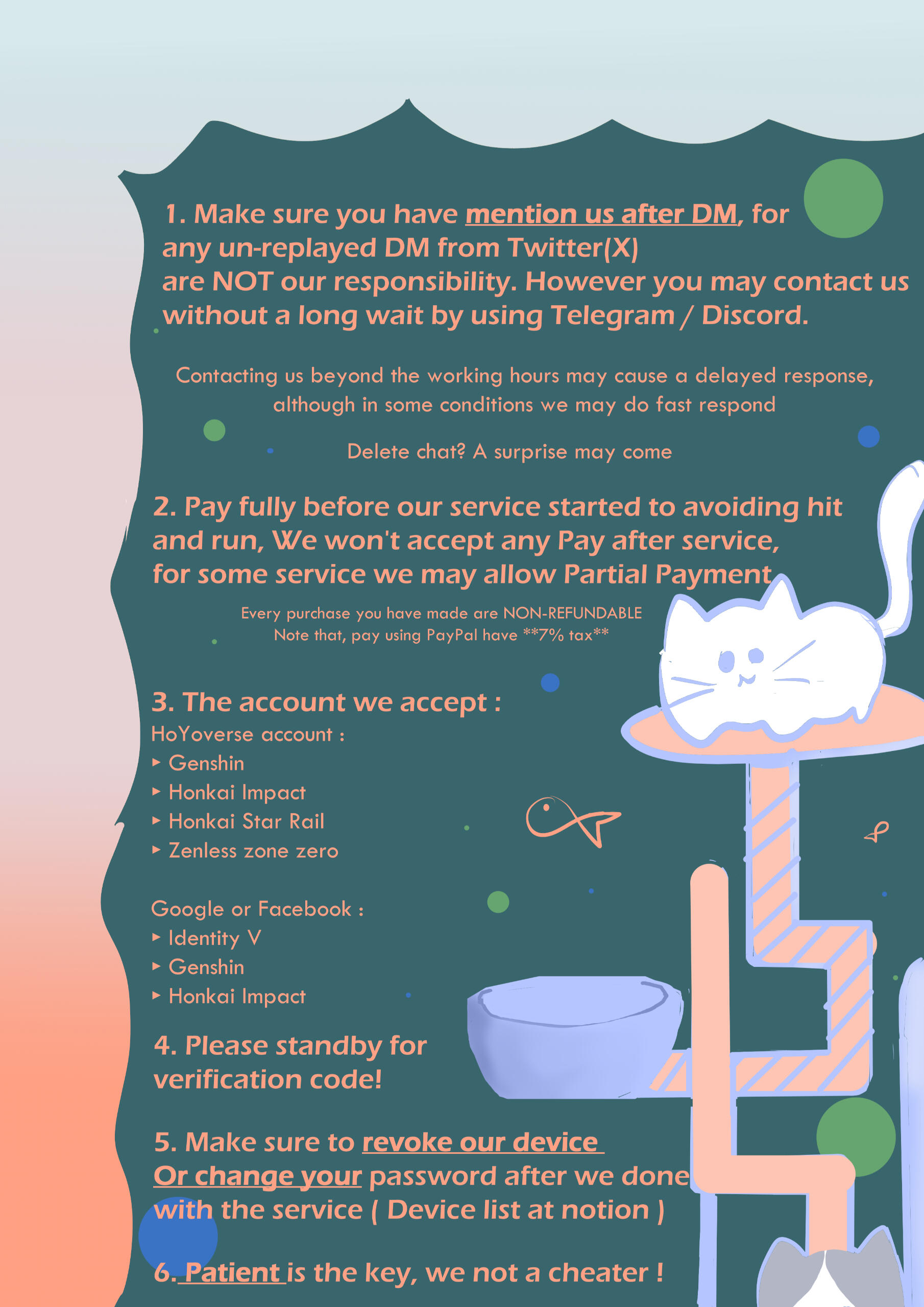 1. You must aware of the art you need elio to render or redraw, make sure it safe for use. (Elio won't do double check he just a cat! Spare him please)2. Make sure you know the art will be consumed by AI to get enhanced (AI Required to Enhance pictures quality) !3. The cat need 3 until 7 days working days per item to be delivered well safe for you, if you need it ASAP please let the cat know~
